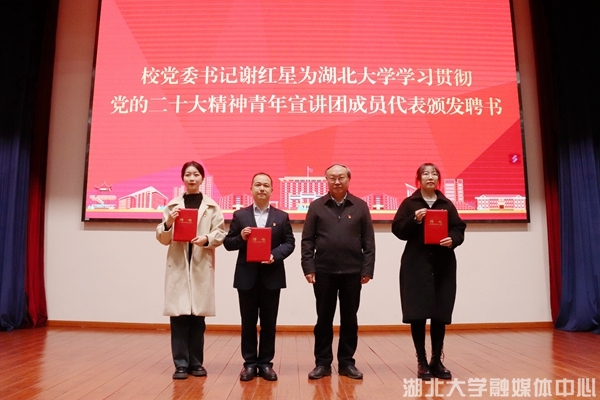 据悉,为进一步推动党的二十大精神在全校青年中落地生根、开花结果,学校专门组建成立学习贯彻党的二十大精神青年宣讲团,开展青年特色宣讲活动。报告会前,谢红星为青年宣讲团成员代表颁发了聘书。生命科学学院党委副书记张精文、商学院2020级金融学专业学生邓范宇果作为青年讲师团成员代表作了交流发言。
